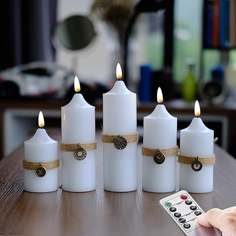 Neu Flackernde Flamme Kerzen Set Mit 5 Weisse Led Batteriekerzen Mit Handgemachtes Hanfseil Und Anhanger Fernbedienung Timer Funktion Amazon De Beleuchtung